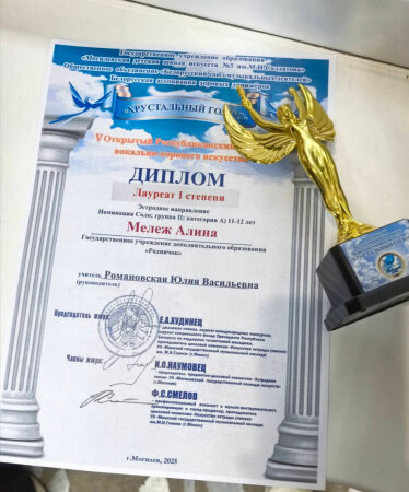 28- 29 ноября в г. Могилёве, в ДШМ N3 им.М.Н. Солдатова, проходил V Открытый Республиканский конкурс вокально-хорового искусства. Учащаяся 6 "В" класса Мележ Алина стала Лауреатом І степени в номинации соло. Искренне поздравляем Алину с замечательной победой и желаем ей новых творческих взлетов.