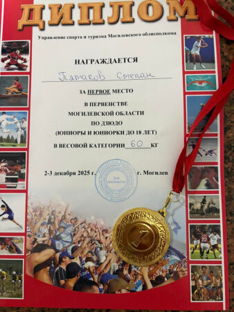Учащийся 10 «Б» класса Пятаков Степан в Первенстве Могилёвской области по дзюдо 2-3 декабря 2025 года завоевал первое место и был награждён золотой медалью. Степан продемонстрировал отличную подготовку, силу духа и волю к победе на пути к заслуженной награде. Гордимся своим одноклассником и желаем Стёпе дальнейших успехов и побед в спорте! 🌟🌟🌟