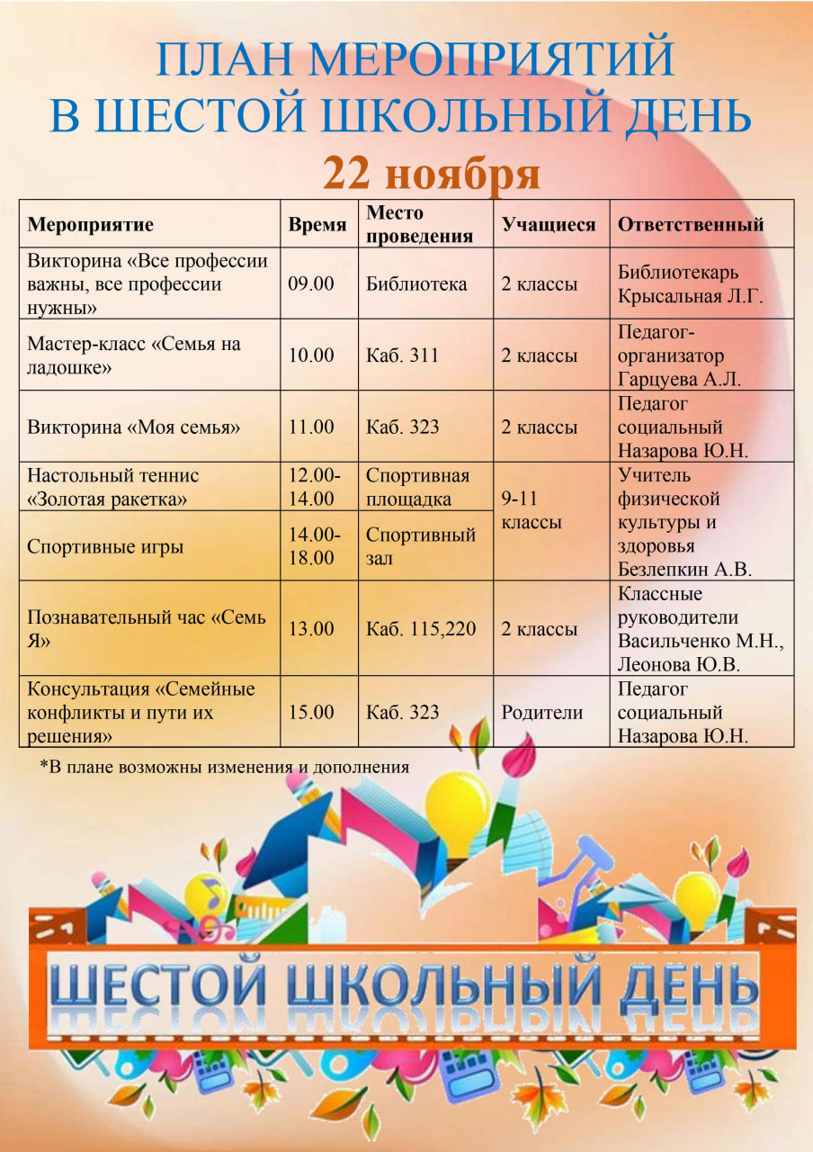 План мероприятий в шестой школьный день 22.11.2025 г.