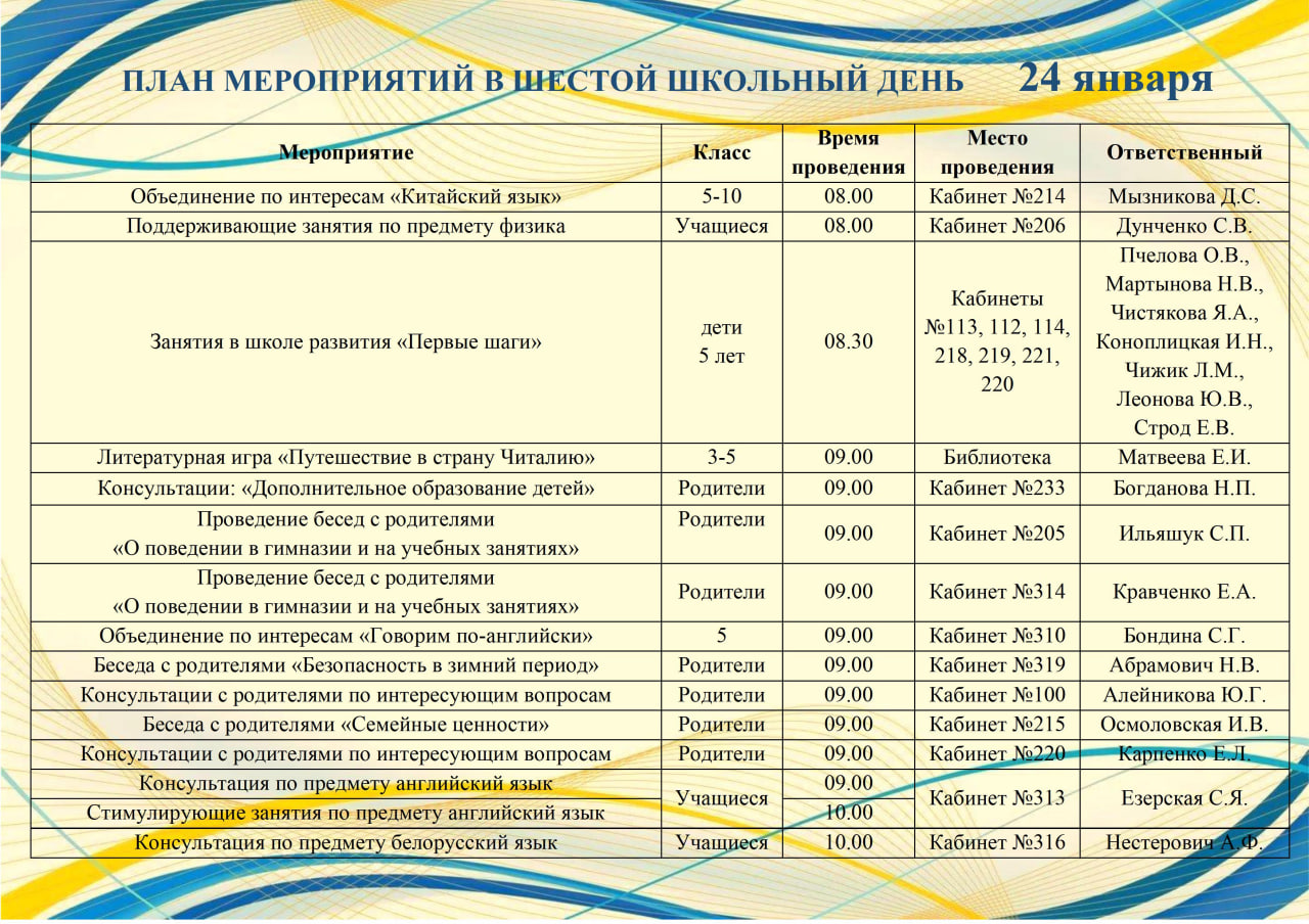 Государственное учреждение образования "Гимназия №3 г.Могилёв" » Суббота в гимназии » План мероприятий в шестой школьный день 24.01.2026 г.