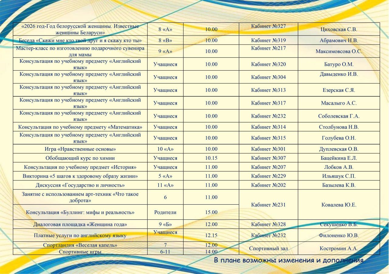 Государственное учреждение образования "Гимназия №3 г.Могилёв" » Суббота в гимназии » План мероприятий в шестой школьный день 07.03.2026 г.