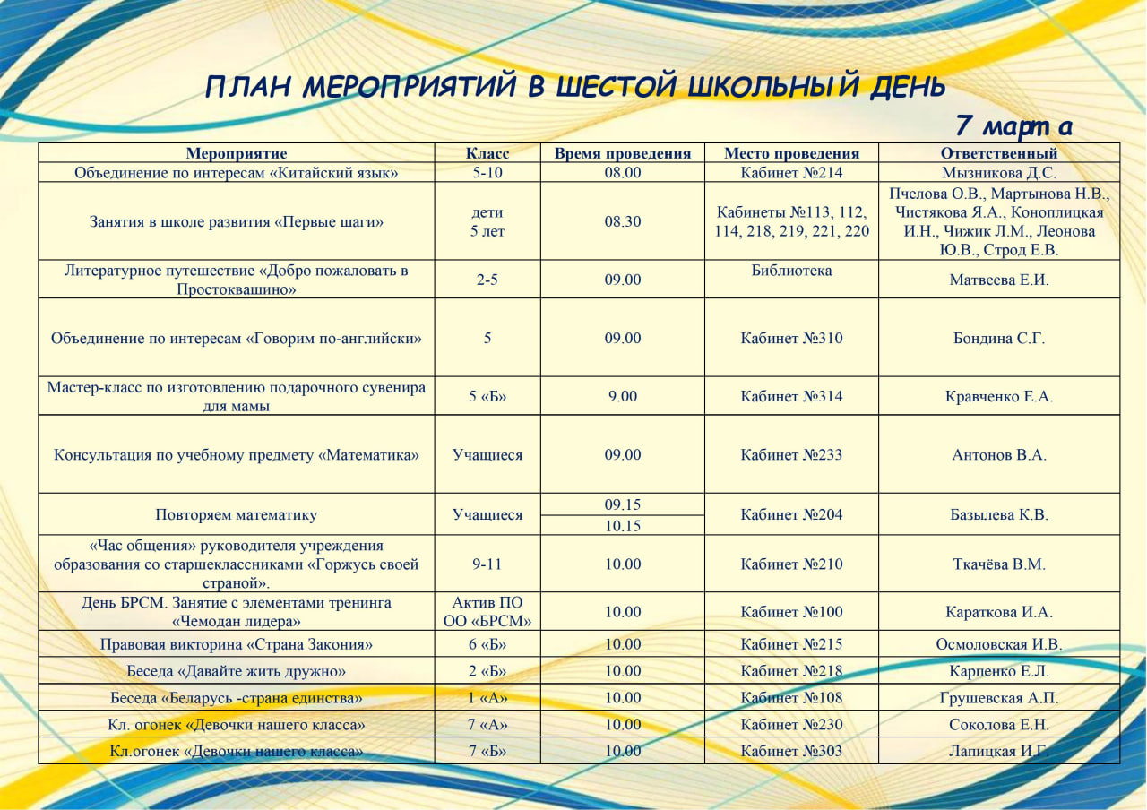 План мероприятий в шестой школьный день 07.03.2026 г.