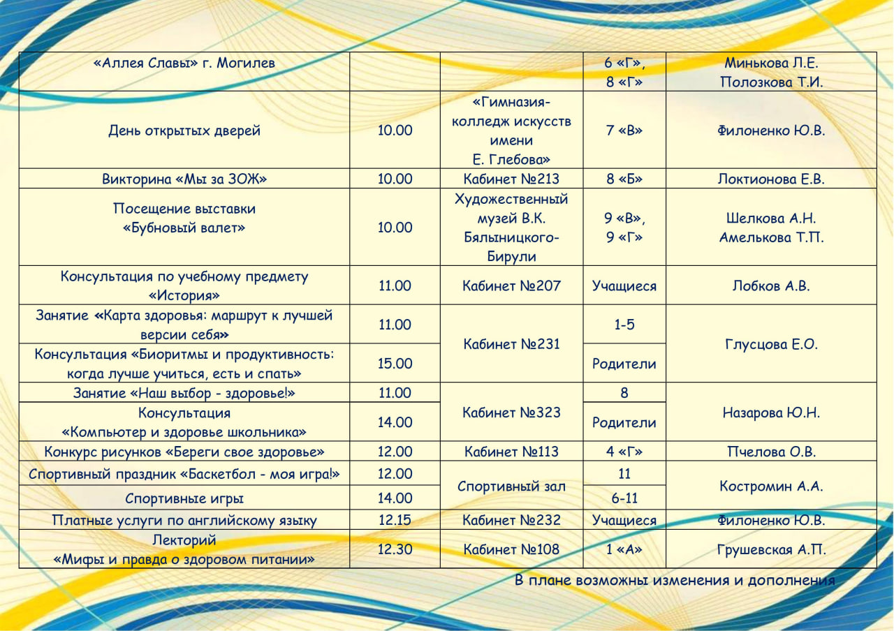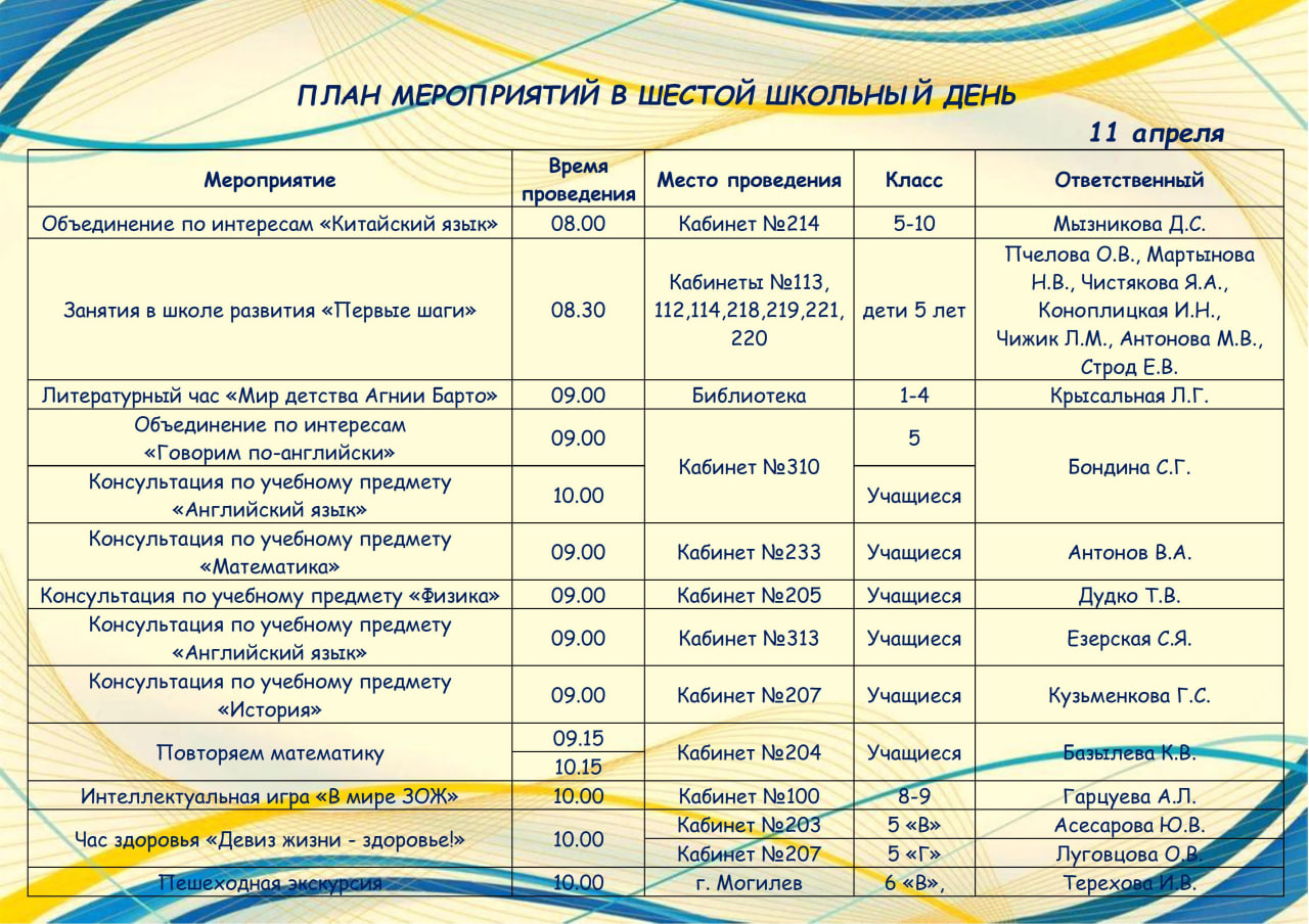 Государственное учреждение образования "Гимназия №3 г.Могилёв" » Суббота в гимназии » План мероприятий в шестой школьный день 11.04.2026 г.