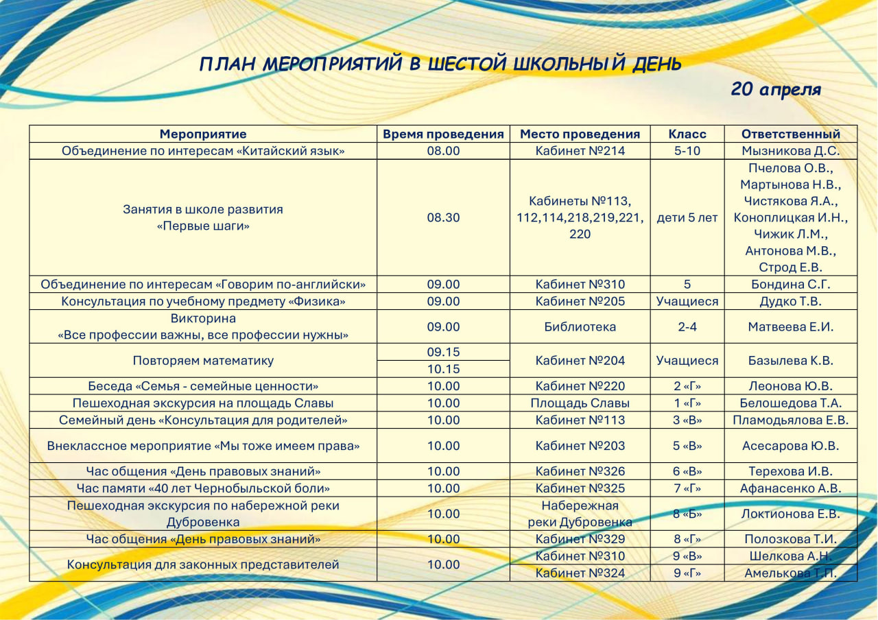 План мероприятий в шестой школьный день 20.04.2026 г.