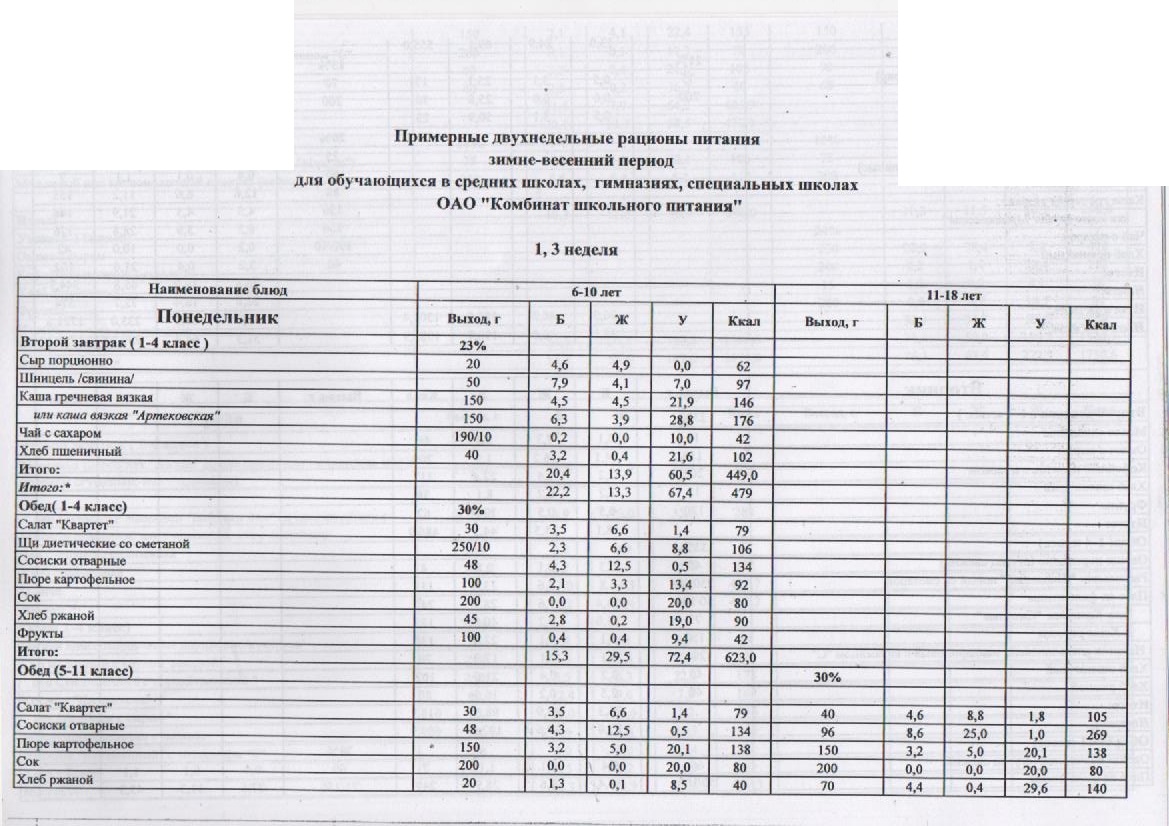 двухразовое питание (длительность пребывания 6-8 часов)