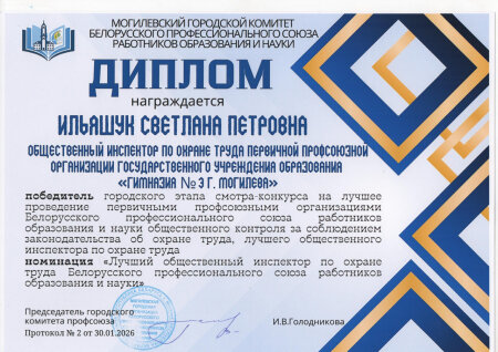 Профсоюзная организация гимназии №3 стала победителем городского этапа смотра-конкурса на лучшее проведение первичными профсоюзными организациями Белорусского профессионального союза работников образования и науки общественного контроля за соблюдением законодательства об охране труда. Лучшим общественным инспектором по охране труда признана Ильяшук С.П.