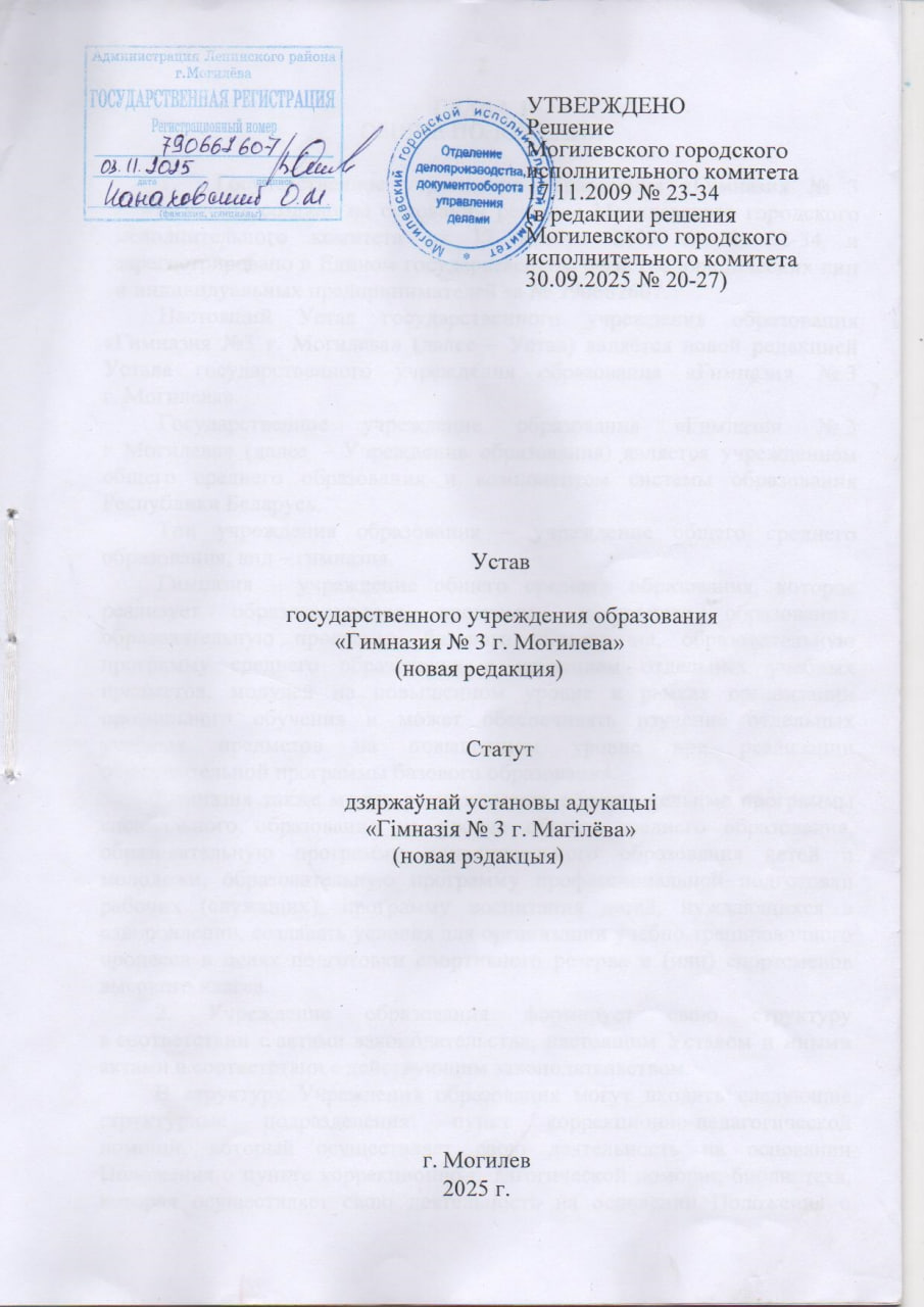 Настоящий Устав государственного учреждения образования «Гимназия №3 г. Могилева» (далее – Устав) является новой редакцией Устава государственного учреждения образования «Гимназия № 3 г. Могилева».