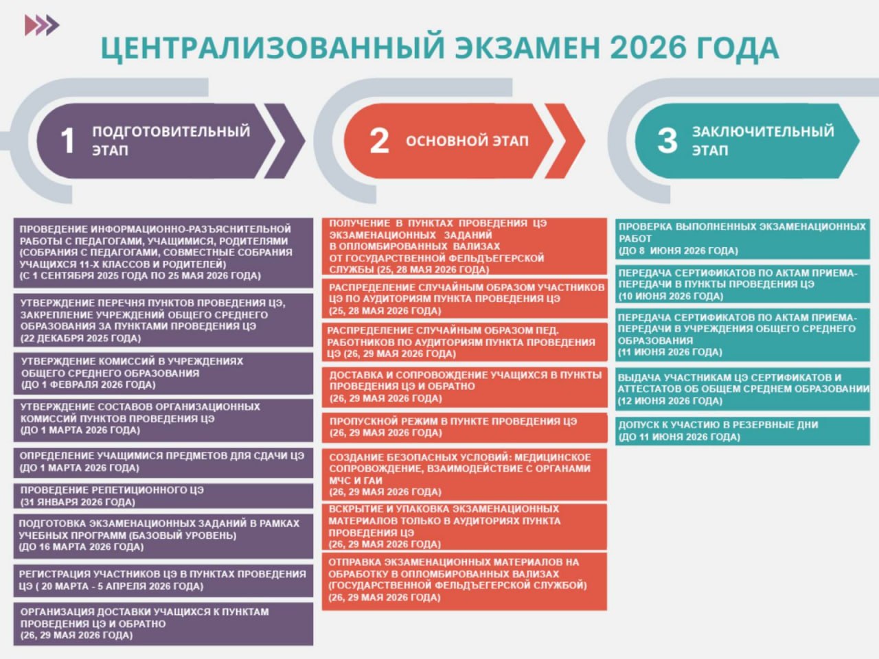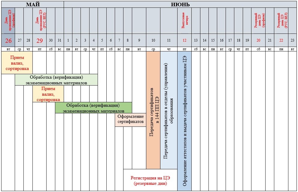 общего среднего образования итоговые испытания в виде выпускного экзамена проводятся в основные сроки – с 1 по 10 июня 2026 г., в иные сроки – с 17 по 24 августа 2026 г.: